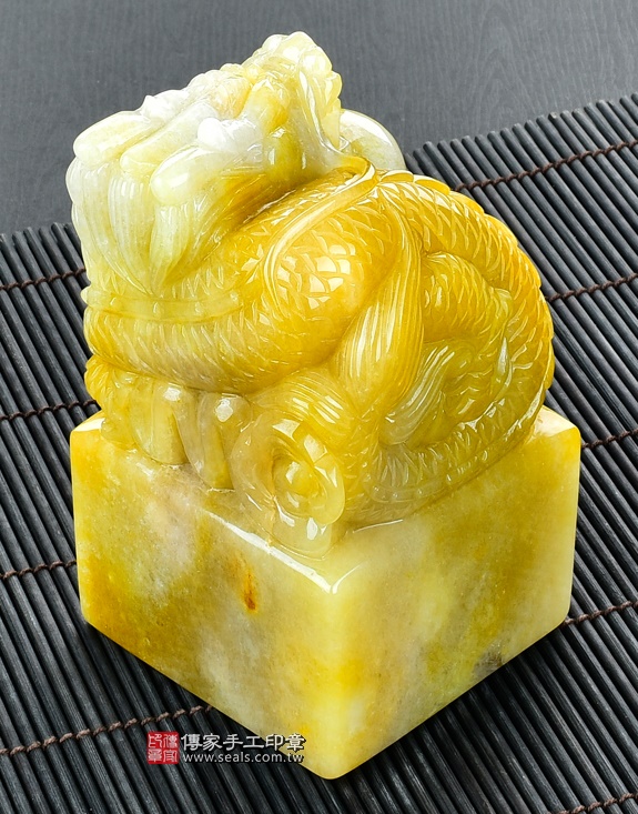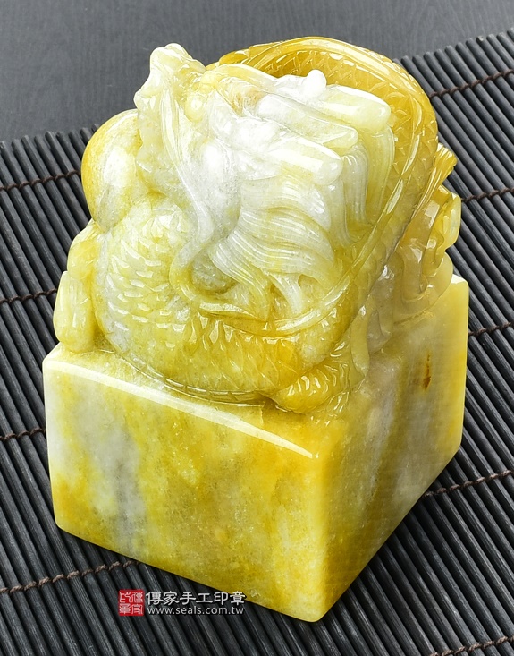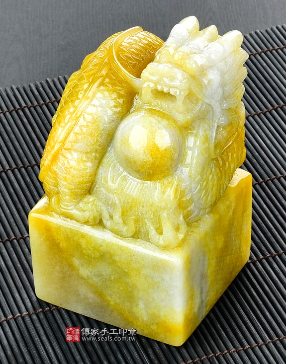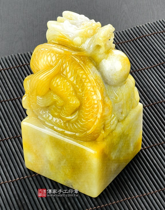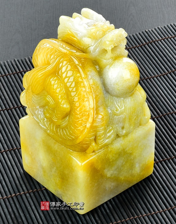 頂級中國新疆黃玉精雕神龍吐珠:廟章、神明印章、大印章會依現貨尺寸不同,每一隻印章的定價都不一樣。