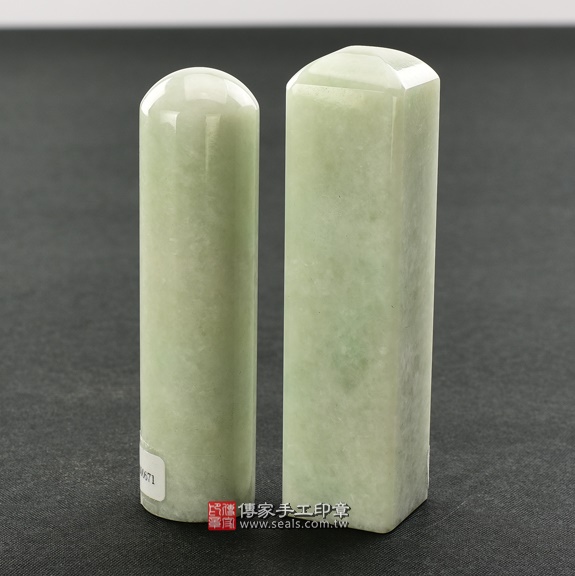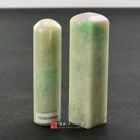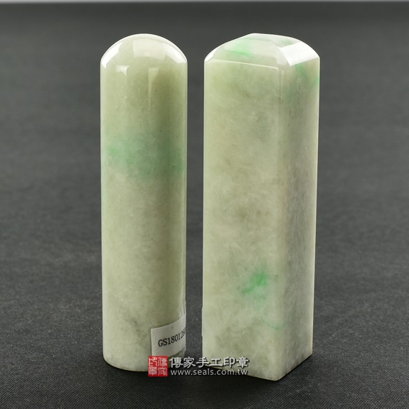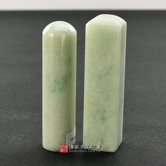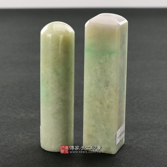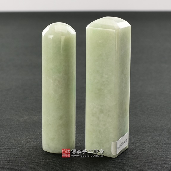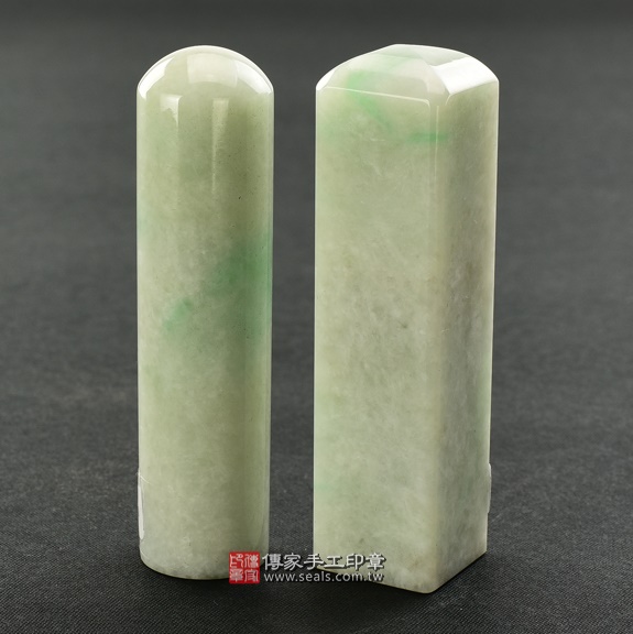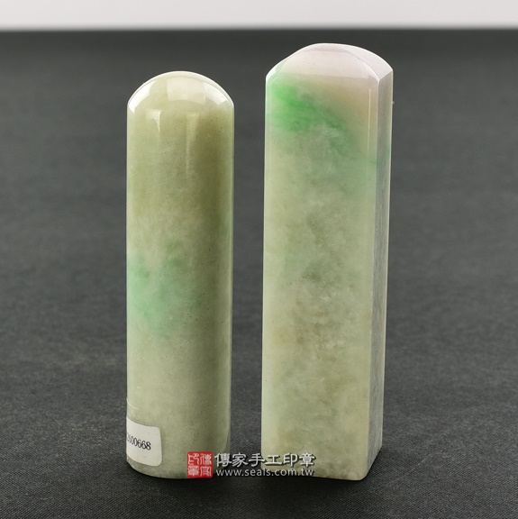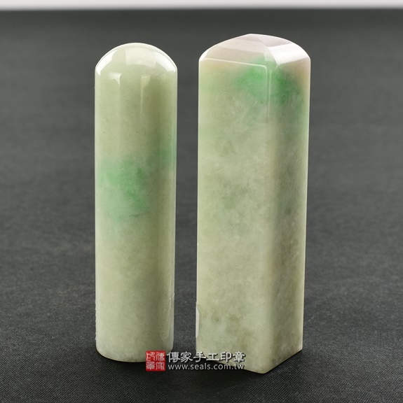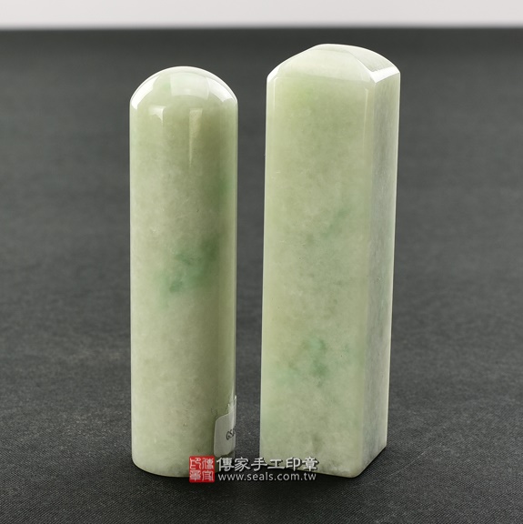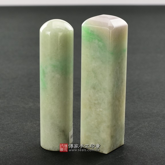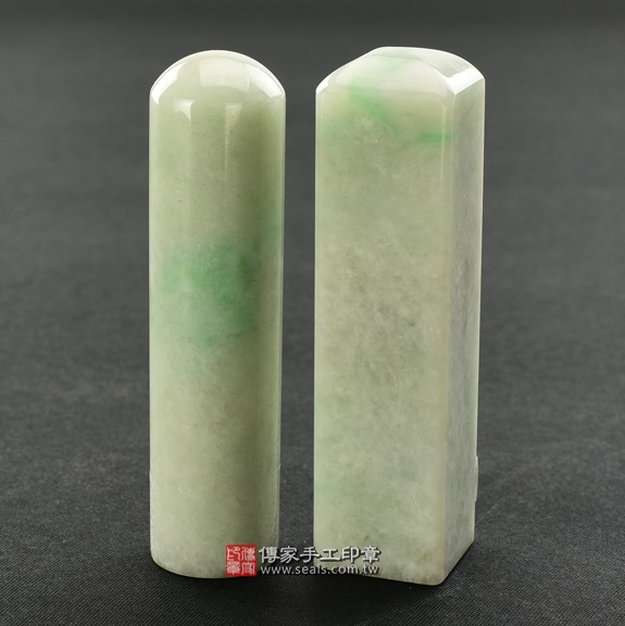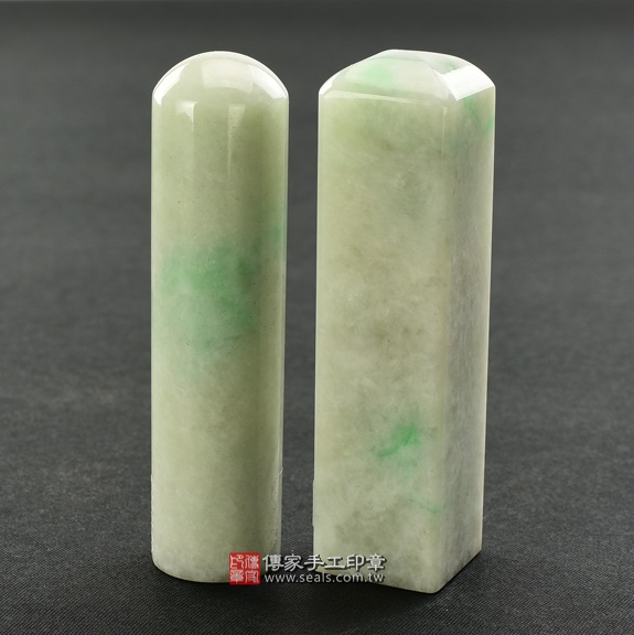 一. 傳家手工印章實際成品: 頂級細豆種飄花白底青緬甸玉翡翠(一般型) 及頂級細豆種飄花白底青緬甸玉翡翠(加長型)