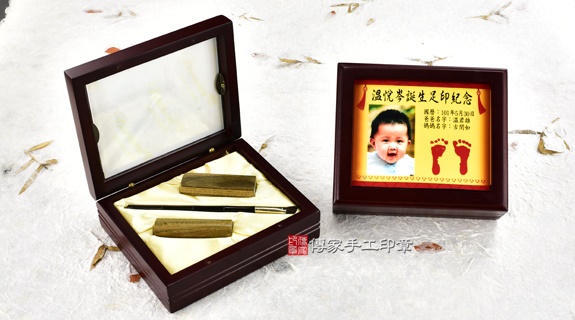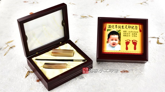 左邊為玻璃木盒、彩色足印照片、黑檀木臍帶胎毛印章、小支黑牛角胎毛刷