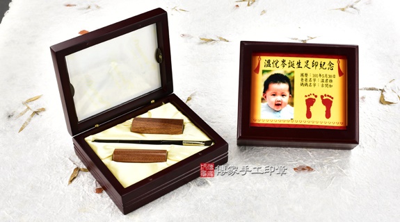 右邊為玻璃木盒、彩色足印照片、紅紫檀木臍帶胎毛印章、小支赤牛角胎毛刷
