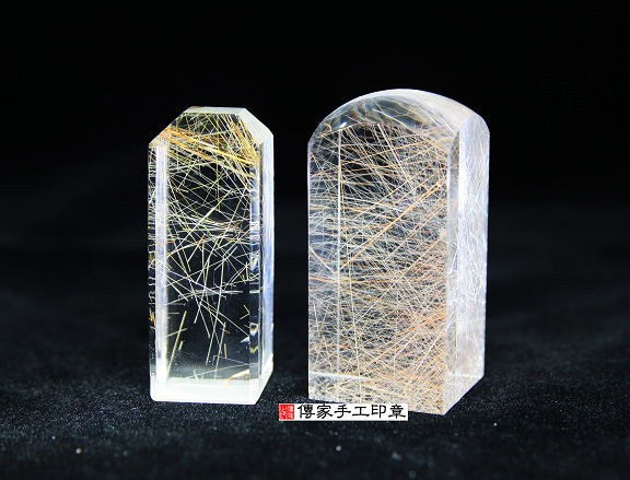 1. 傳家手工印章嚴選高級「頂級鈦髮晶公司大小章」。鈦髮晶的硬度很硬,大約是7度,是非常珍貴的頂級的印材。