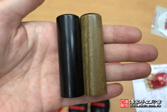 張小姐幫小孩挑選黑檀木和綠檀木的材質,